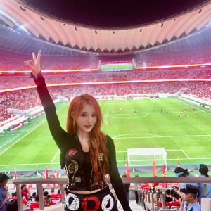 大秀美腿,女团成员周是汝现场观看U22男足vs澳大利亚